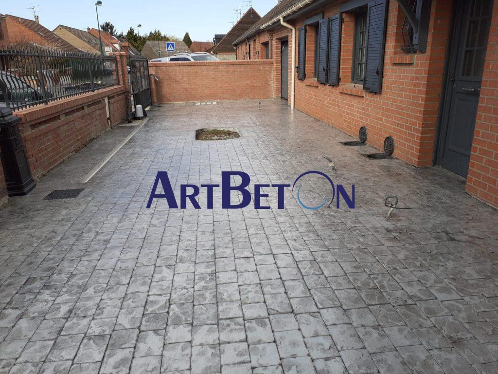 - Amprentarea suprafeței: Folosind matrite speciale, se imprimă modelul dorit în beton. Matritele se aplică în sensul în care s-a turnat betonul, rând pe rând.